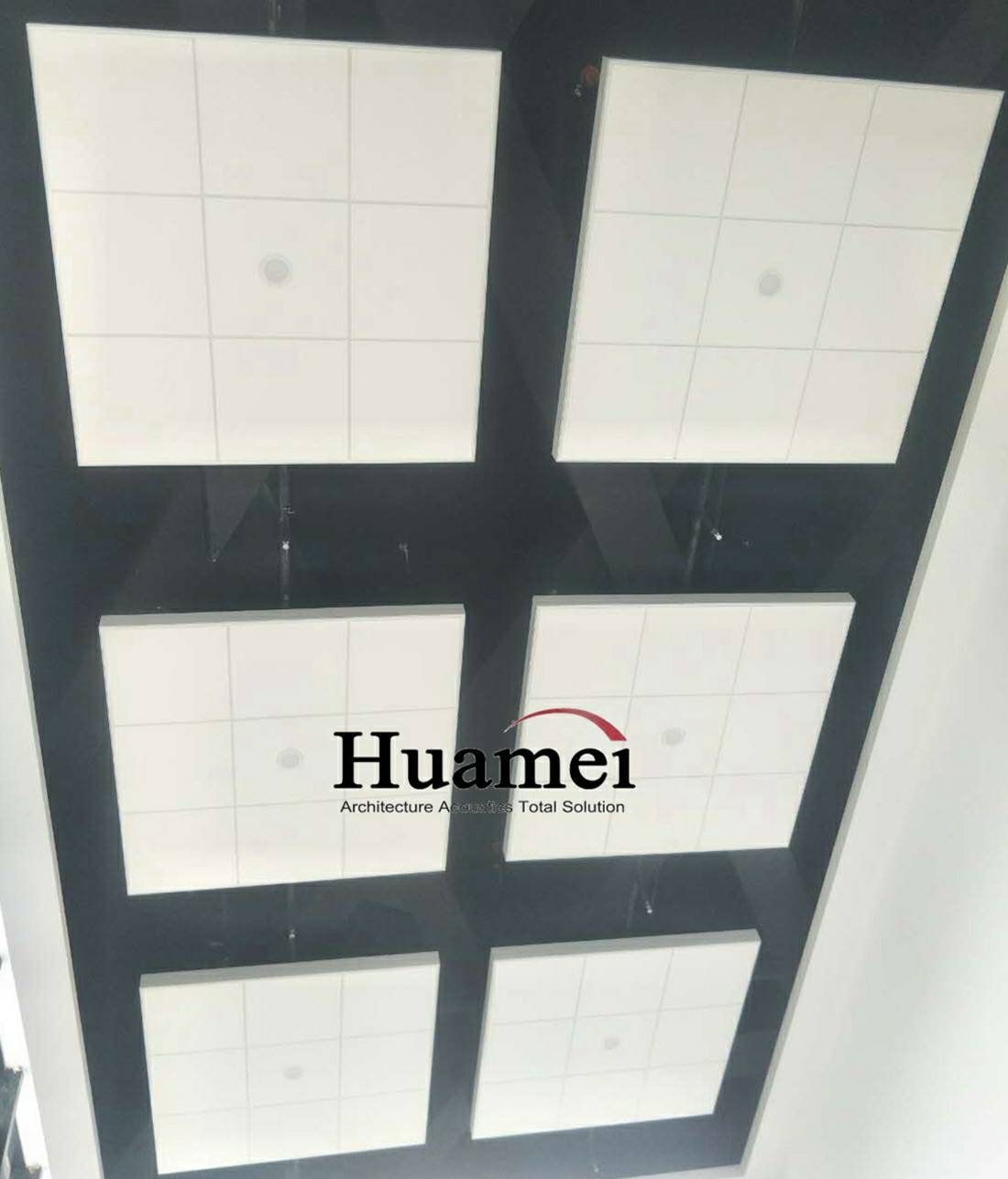 该项目所采用的超大尺寸的异形吸声体由多片600x600mm尺寸的玻纤吸音天花板以及金属装饰条组合而成。